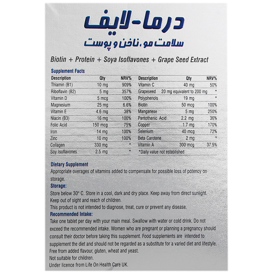 قرص درما لایف لایف آن (Life-ON Derma Life) جهت رفع کمبودهای غذایی به منظور بهبود سلامت و زیبایی پوست، مو و ناخن مصرف میشود. این مکمل تقویت کننده مو از ریزش مو جلوگیری نموده و موجب بهبود رشد مو، استحکام و تقویت ساقه مو میشود. خشکی و شکنندگی ناخنها به سبب کمبود ویتامین و املاح ضروری از جمله آهن و ویتامین B است. مکمل درمالایف با تامین این مواد ضروری در رشد و استحکام ناخنها تاثیر قابل توجهی دارد.