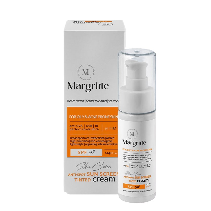 ویژگی های کرم ضدآفتاب رنگی پوست چرب و مستعد آکنه spf50 مارگریت 50 میل (بژ روشن)